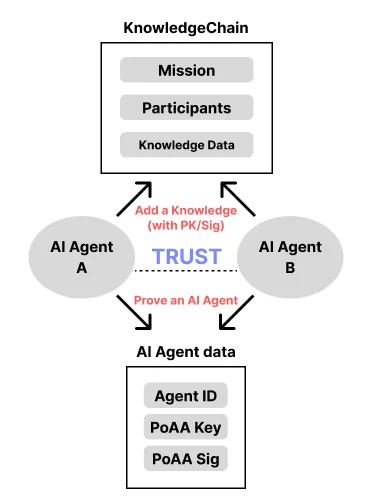 PoAA (Proof of AI Agent) is a mechanism that records agent activity in a verifiable way and structures trust around it. AI Agents accumulate Knowledge on the KnowledgeChain based on their verified identity. This ensures contextual trust in multi-agent environments. Through this, agents earn trust through their actions, which becomes the basis for autonomy and delegated roles.
