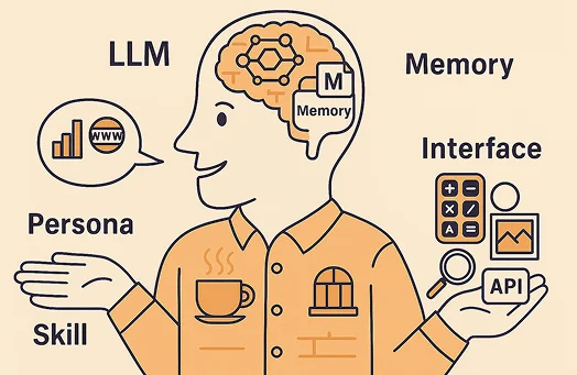 AI agents are structurally designed to resemble the human cognitive system. Each element corresponds to parts of the human brain, personality, hands, and sensory organs, enabling them to actively interact with their environment.
